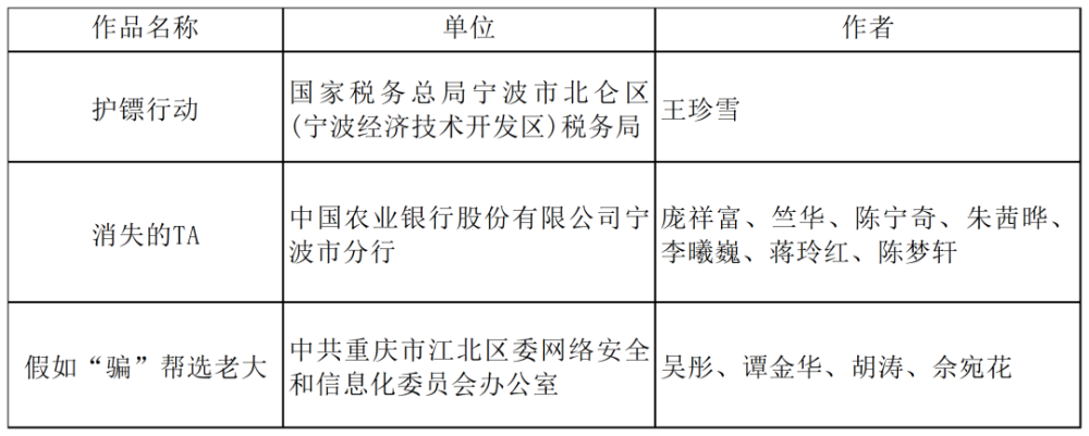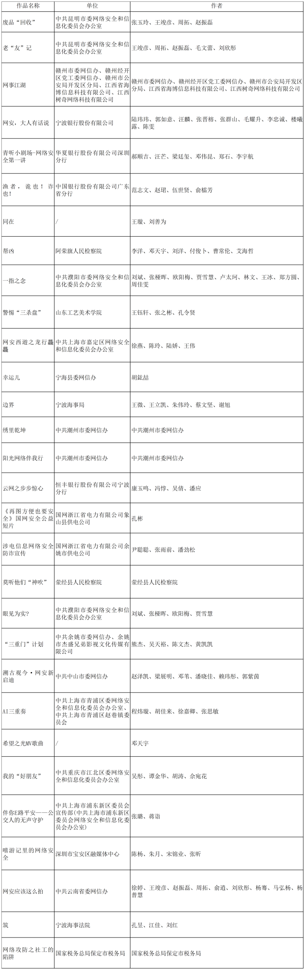 本次活动以“网络安全为人民,网络安全靠人民”为主题,向全社会公开征集微视频,自8月启动以来,全国网友积极参与、作品精彩纷呈,共收到来自全国各地的报名作品近600个。经9月4日专家评审,共评选出一等奖作品1个,二等奖作品2个,三等奖作品3个,优秀参与奖作品30个。