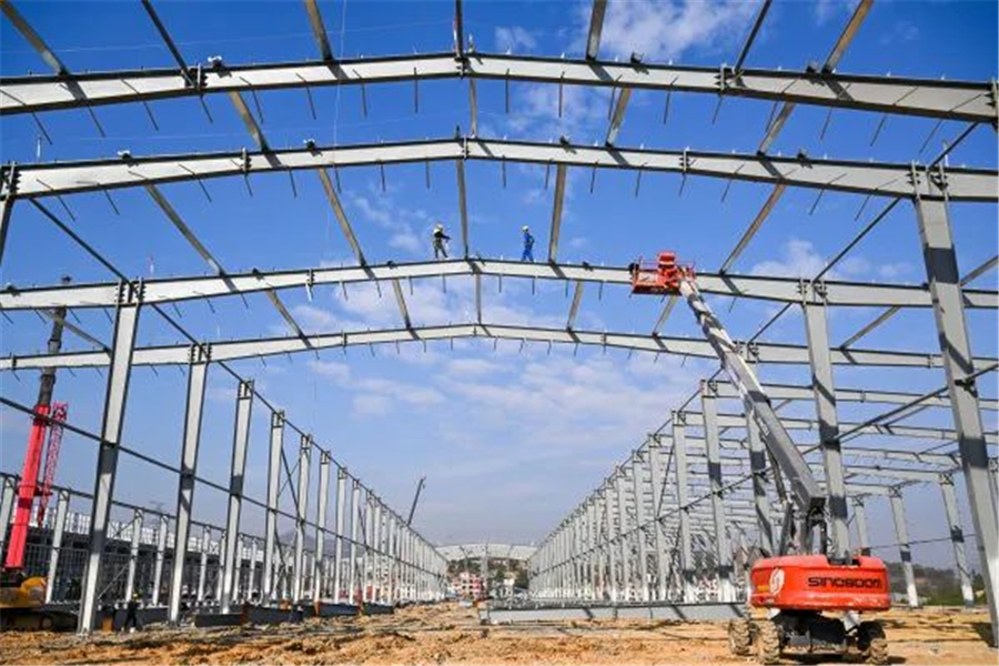 2023年11月29日,新田县产业开发区湖南鲁丽绿色新材料科技产业园项目工地,施工人员在加紧安装厂房钢结构。湖南日报全媒体记者 郭立亮 通讯员 钟伟锋 摄
