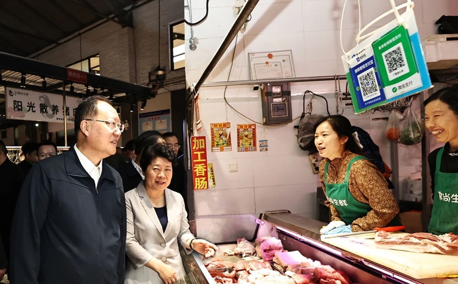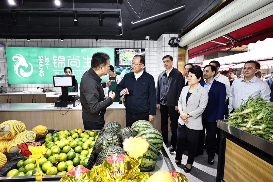 锦尚生鲜市场是长沙市最大的零售农贸市场,占地面积近1.5万平方米,拥有380多个摊位,新鲜蔬菜、应季水果、海鲜水产等一应俱全。“蔬菜价格还稳定吗?”“猪肉是从哪儿进货?”毛伟明来到熟食、蔬菜、猪肉等多个摊位前,与忙碌的摊主和顾客亲切交流,并参观食品安全快检室,详细询问货源渠道、销量价格、质量检测等情况。毛伟明强调,要加强节日热销食品、大宗食品和重点领域监管,健全完善从“田间地头”到“百姓餐桌”的全过程食品安全追溯体系,进一步规范生产经营行为,营造安全放心的食品消费环境,确保节日期间“米袋子”“菜篮子”“果盘子”质优量足价稳,守护好群众“舌尖上的安全”。