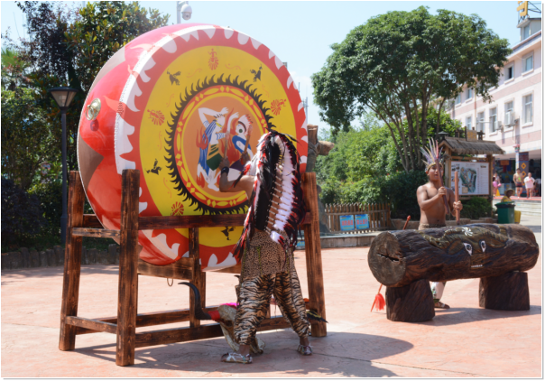 印第安人对“鼓”有一种神秘的崇拜,认为鼓的形状像孕妇的大肚子,象征着旺盛的生命力。百年乃至千年大树制成的通天神谷尤为神圣,用尽全身的力量去敲响通天神鼓表达着对生命最真诚的尊重以及美好的祝愿。每天上午10:00-10:30,酋长都会带领他的部族众人,高举牛头,在通天神鼓和图腾柱前面载歌载舞,表达对世间万物的感谢及敬重。