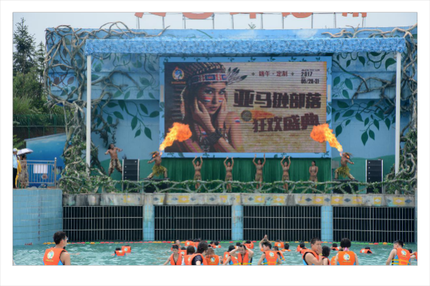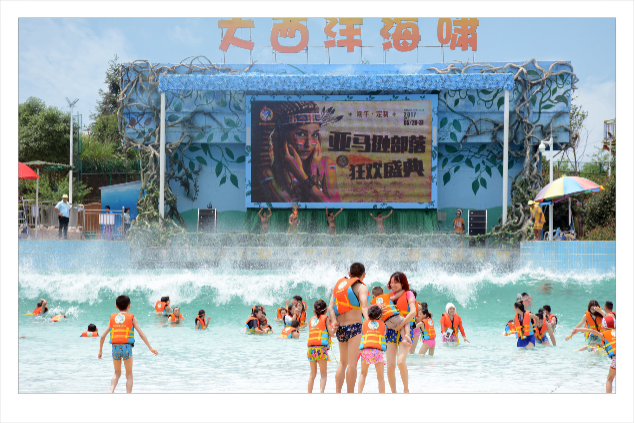 6千平米的海啸池,大型表演舞台演绎着亚马逊丛林热舞、动感的音乐,高达三米的巨浪、泳装美女、尖叫声、欢笑声、喝彩声响成一片,摇滚激情日不落!