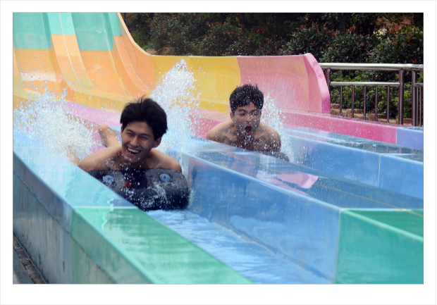 4人组队从近20米高的平台上快乐出发,在高空滑行冲荡,翱翔星际,突然垂直跌落,冲向远方没有阻碍的滑板,就在心快要跳出来之际,皮筏向后扯动快速跌入落水池,不由拍拍胸口,有险象环生的快感!