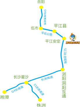 湘潭方向:京港澳高速—长永—长浏—洞阳互通—平汝高速—安定出口—亚马逊水上乐园