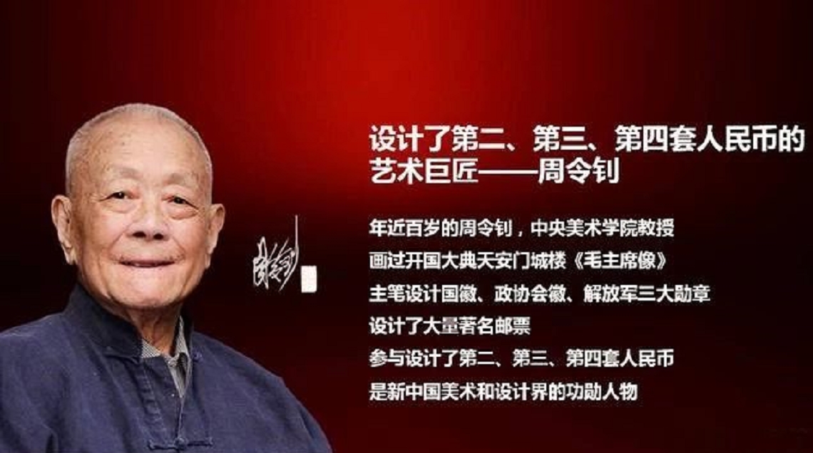 周令钊,湖南平江人,中央美术学院教授。代表作有中华人民共和国的第一张海报《复活》、油画《五四运动》,他设计或参与设计的作品包括开国大典天安门城楼上的毛主席像、中华人民共和国国徽、少先队队旗、共青团团徽、第二至四套人民币等。他用手中妙笔,描绘出国家形象,展现民族荣光,被誉为中国艺术设计大师。在耄耋之年,他初心不改,心系祖国接班人培养,对美育工作、美术事业发展不懈追求,为国家培养了大批优秀人才。获中国文联第十届造型艺术成就奖。
