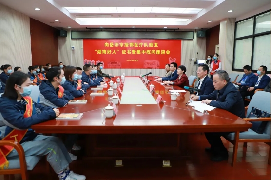 “你们用爱心点燃希望,用执着拯救生命的英雄事迹令人动容,值得全社会广泛宣传学习……”4月24日,岳阳市委宣传部、市文明办集中慰问平江援鄂医疗队,将“湖南好人”证书和《你信大爱我信你——潇湘家书·抗疫篇》送到了圆满完成任务的队员手中,向他们的辛勤付出表示衷心感谢。市委常委、宣传部部长马娜,县委副书记肖湘晖,县委常委、宣传部部长熊江新,副县长潘如意参加。