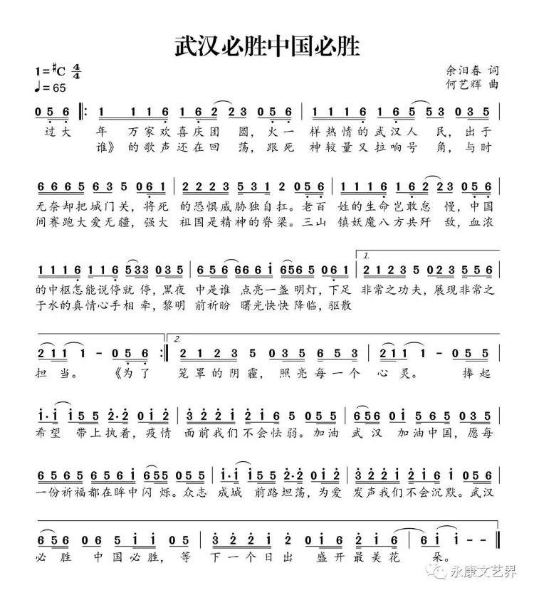一首由湖南省平江籍青年音乐家、浙江佳音艺校校长、永康市文化项目专家指导组成员何艺辉作曲,平江县水务局原副局长余汨春作词,佳音艺校教师演唱的抗击疫情公益歌曲《武汉必胜中国必胜》,表达出了人们对祖国的热爱,对英雄的景仰,对打赢这场歼灭战的必胜信心。