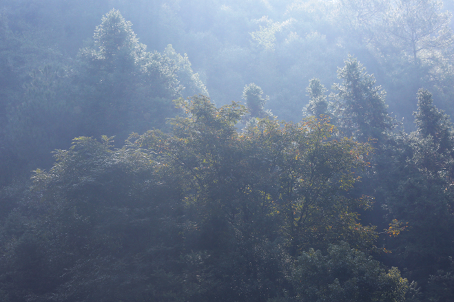 我们走进烂泥洞的时候,十月底的秋阳还刚刚越过山丘,山谷里的雾在阳光下渐渐稀薄,两岸树林里的朝露还未褪去,经阳光一照,散发出数不尽星星点点的晶莹白光,像灰姑娘穿上了水晶鞋般,一下拥有了无可挑剔的美。