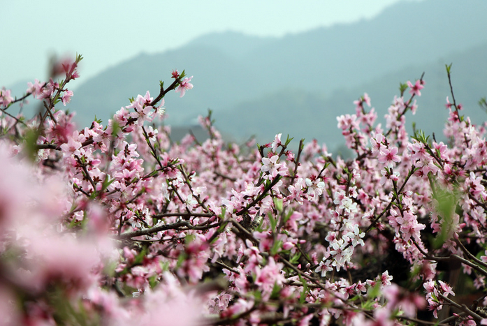 春天的桃花园是记忆中的一大美景,桃树全部种在一块山坡上,无论从哪个角度看,它都呈现一个梯形状,一层一层错落有致。桃花开的时候,落英缤纷,粉红漫天,我们最喜欢穿梭其中,双手迎接花瓣,转着圈圈,似乎自己就是身着粉红裙装的桃花仙子。
