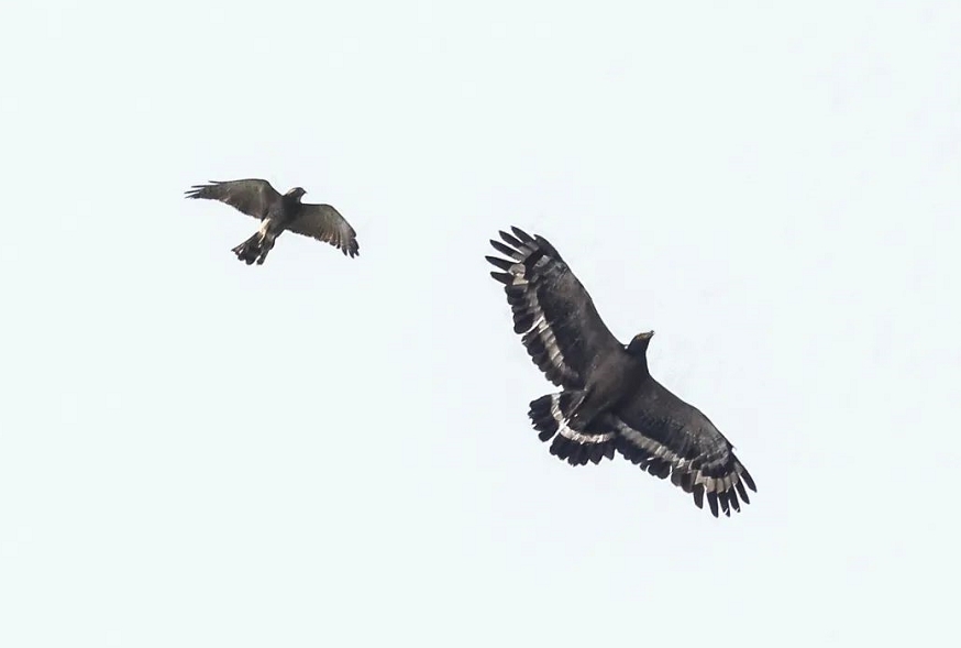 近日,平江“鸟叔”在迎瑞村拍鸟时无意中发现三只大鸟在空中盘旋,凭着多年与鸟类打交道的经验,他认定这是两年前曾经碰到过的蛇雕。他马上举起相机进行拍摄,三只蛇雕高空中盘旋几秒钟后就急速远去。