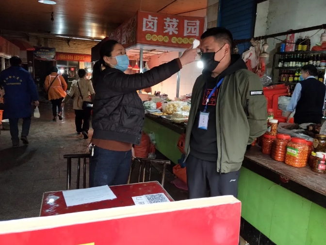 “你好,请出示身份证,到这里测量体温、登记信息,保持最少1米的距离……”西街菜市场入口处,田明带在忙着给进来买菜的市民登记。