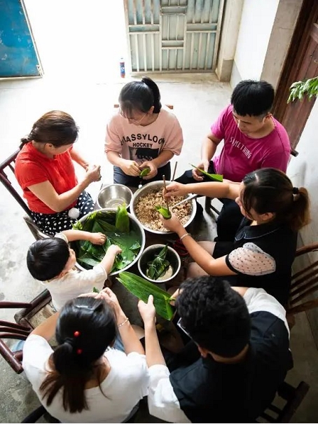 这是三墩乡车田村李美兴家,大门口斜挂着几束艾叶,他们一家人正围在一起包粽子。李美兴一家五口人,两个孩子李仕国、李霞还在上大学,今年他们同其他大学生一样还没去学校复课,能够有机会和家人在节日团聚,感受浓浓的传统端午习俗确实是高兴的事儿。