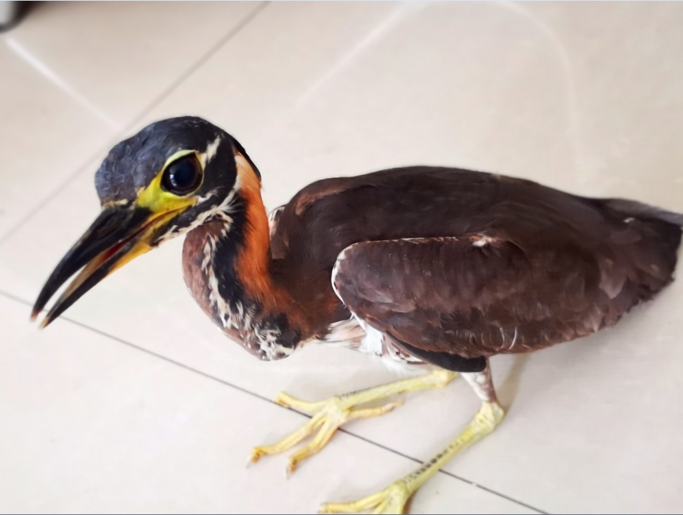 当日上午,三墩乡忠龙村群众在河边发现了这只疑似受伤的海南虎斑鳽,由于以前从未见过这种鸟类,他们认为可能是国家珍稀动物,便赶快报告了三墩乡林业站。接到群众报告后,林业站邹煌宇等工作人员便小心翼翼地将这只怪鸟从现场带回站里,并及时向平江县野生动物救助站进行汇报。于是,野生动物救助站工作人员驱车70多公里赶赴现场进行收容救护。