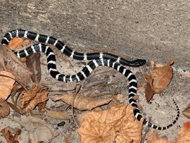 栖息环境:昼伏夜出,尤其闷热天气的晚上出现次数频繁,银环蛇性温和,一般不主动攻击人,栖息于平原、丘陵小山近水,池塘边、田边、路旁、菜园等都有出现。