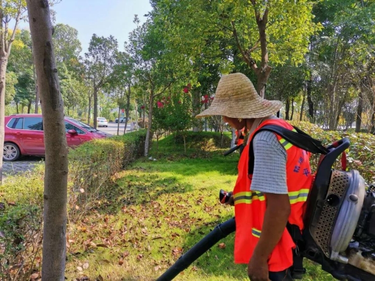 环卫工李松山背着近20斤重的吹风机,穿梭在草坪里。他和同事们要把落在草坪上的落叶吹出来,再打扫干净。