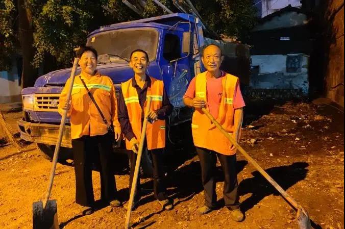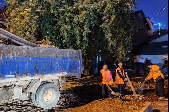 另一边,在昏黄的灯光下,环卫工严利员、凌快如、刘命辉三人还在飞快地挥铲,将地上的杂物装车。他们所处的地方,原本有一个废旧的棚子,破败不堪,就立在路边。为了将这个棚子清理干净,他们已经整整干了一天了。