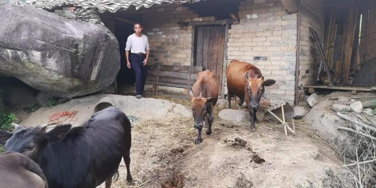 ▲唐林荣正赶着牛去山林里放养