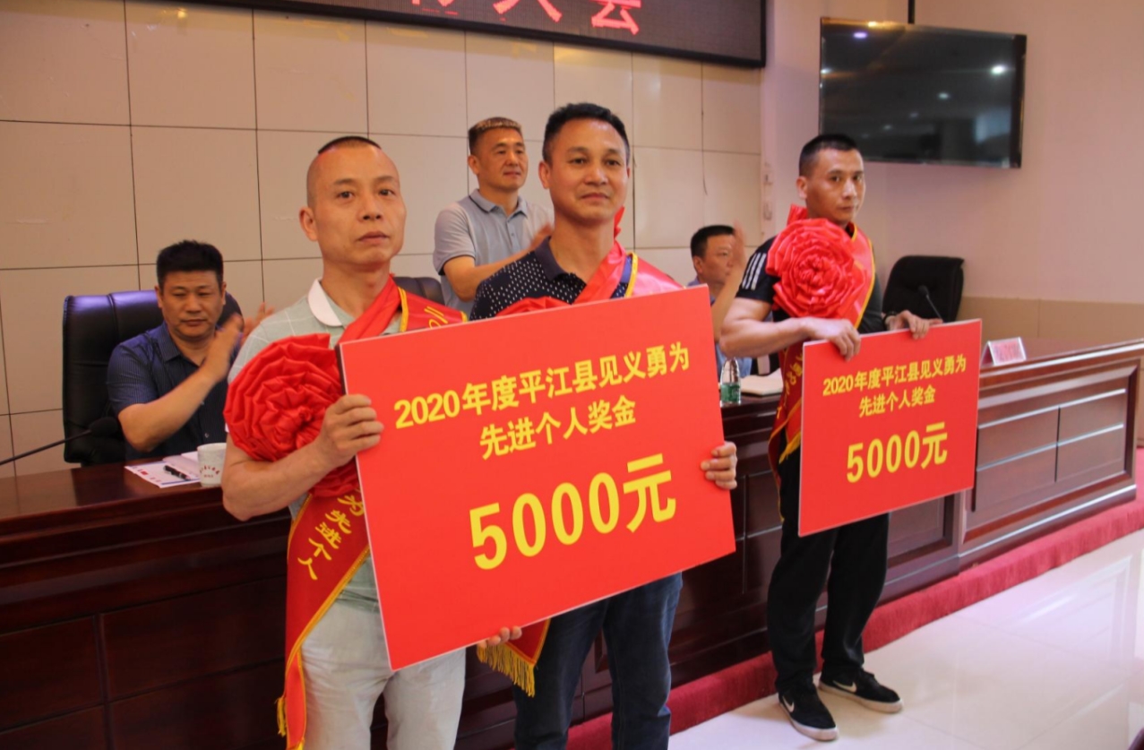 大会宣读了《关于2020年度岳阳市见义勇为先进个人的表扬通报》、《关于2020年度平江县见义勇为先进个人的表扬通报》,授予朱海龙同志为2020年度岳阳市见义勇为先进个人,陈小光等3名同志为2020年度平江县见义勇为先进个人荣誉称号,并向他们颁发荣誉证书和奖金。
