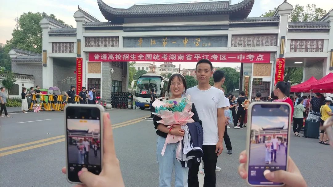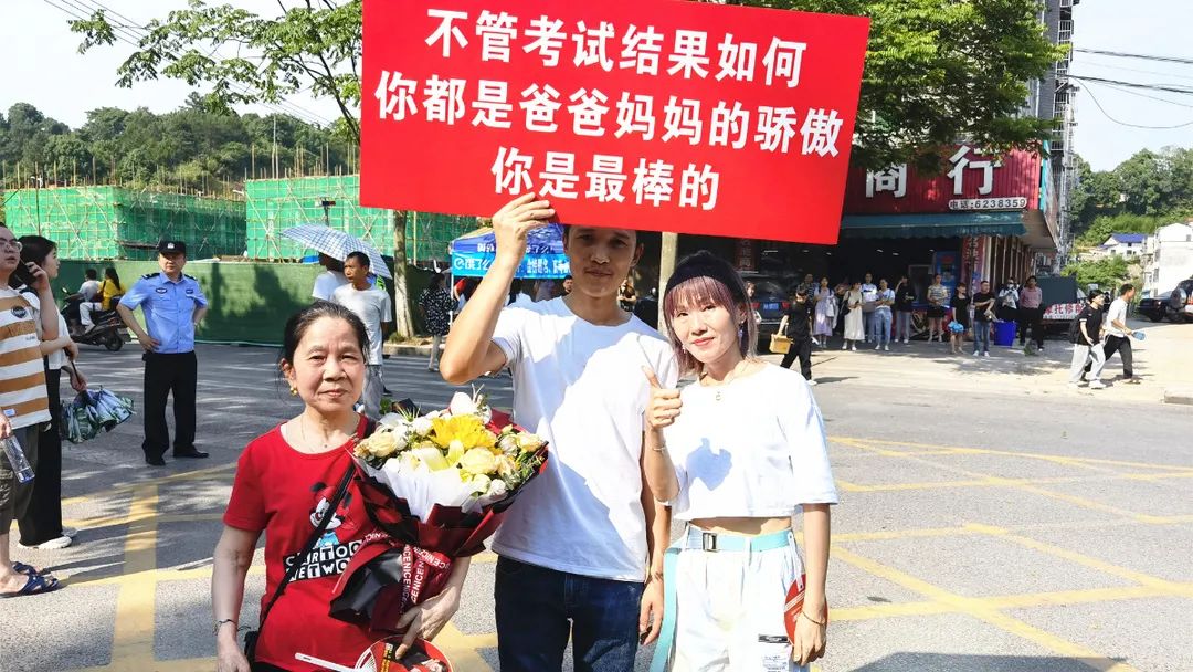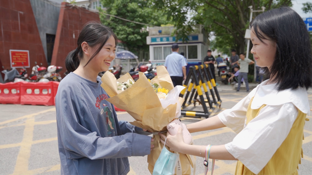 【姑侄】平江二中考点,考生陈思宇冲出考场接到小姑姑献的鲜花,笑开了花,她激动地大喊:“明年,我一定来给你送考!”小姑姑比她还小一岁,在读高二,明年也要参加高考了。