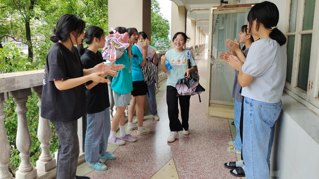 【考生】中午12时25分,下午还有考试的考生在考场走廊欢送已经结束考试的考生。(邱妹平摄)