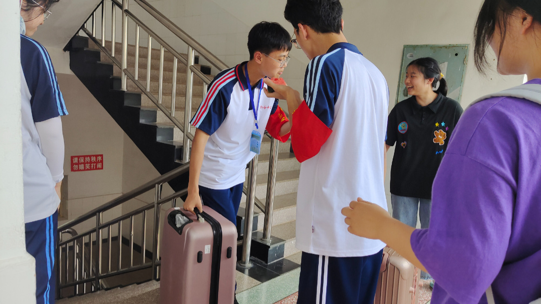 【志愿者】平江一中的学生志愿者热情地帮考试结束的学长学姐们提行李、搬物件。