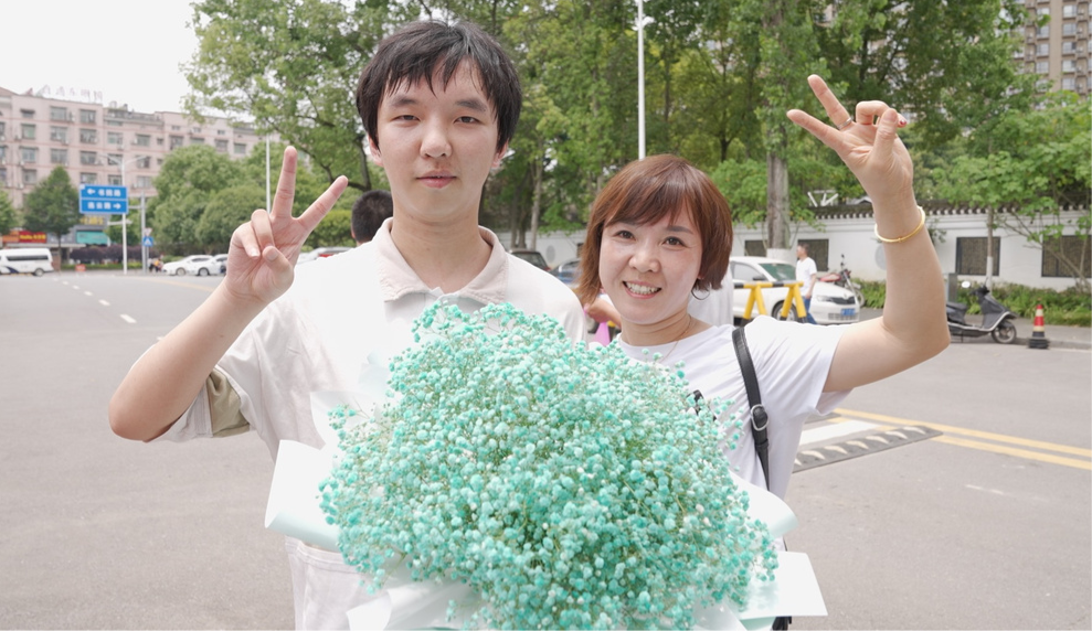 【母子】“看到了,孩子出来了!”在考场外等待许久的妈妈终于见到了儿子,立马将准备好的大束蓝色满天星送上去。母子笑靥如花,对着我们的镜头比了一个耶。