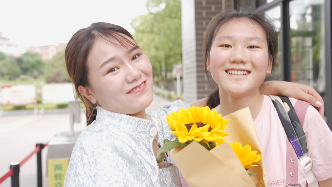 【姐妹】姐姐郑女士连续三天都来平江一中考点,“我比妹妹大了9岁,去年我弟弟高考,我也陪着。”不太习惯表达情感的姐姐拿出向日葵和奶茶送给妹妹,和她来了一个拥抱。