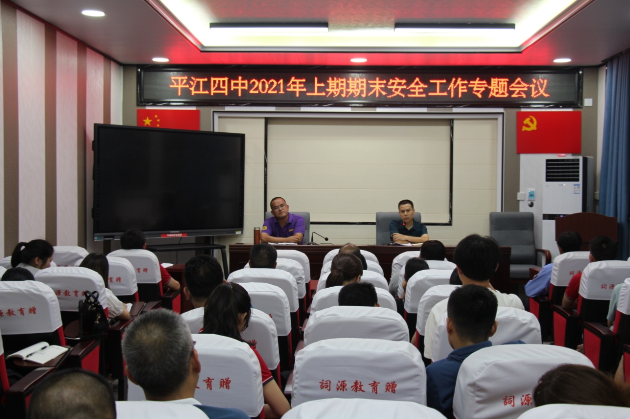 临近期末结束阶段,为压实安全主体责任,推进平安校园创建,6月17日晚,平江四中召开了上期期末安全工作专题会议。学校管理人员、各班主任以及宿管员、保安员、保洁员参加,对前段安全卫生、政教德育工作进行讲评,就中考和期末安全工作进行专项部署,提出了有力的整改措施。