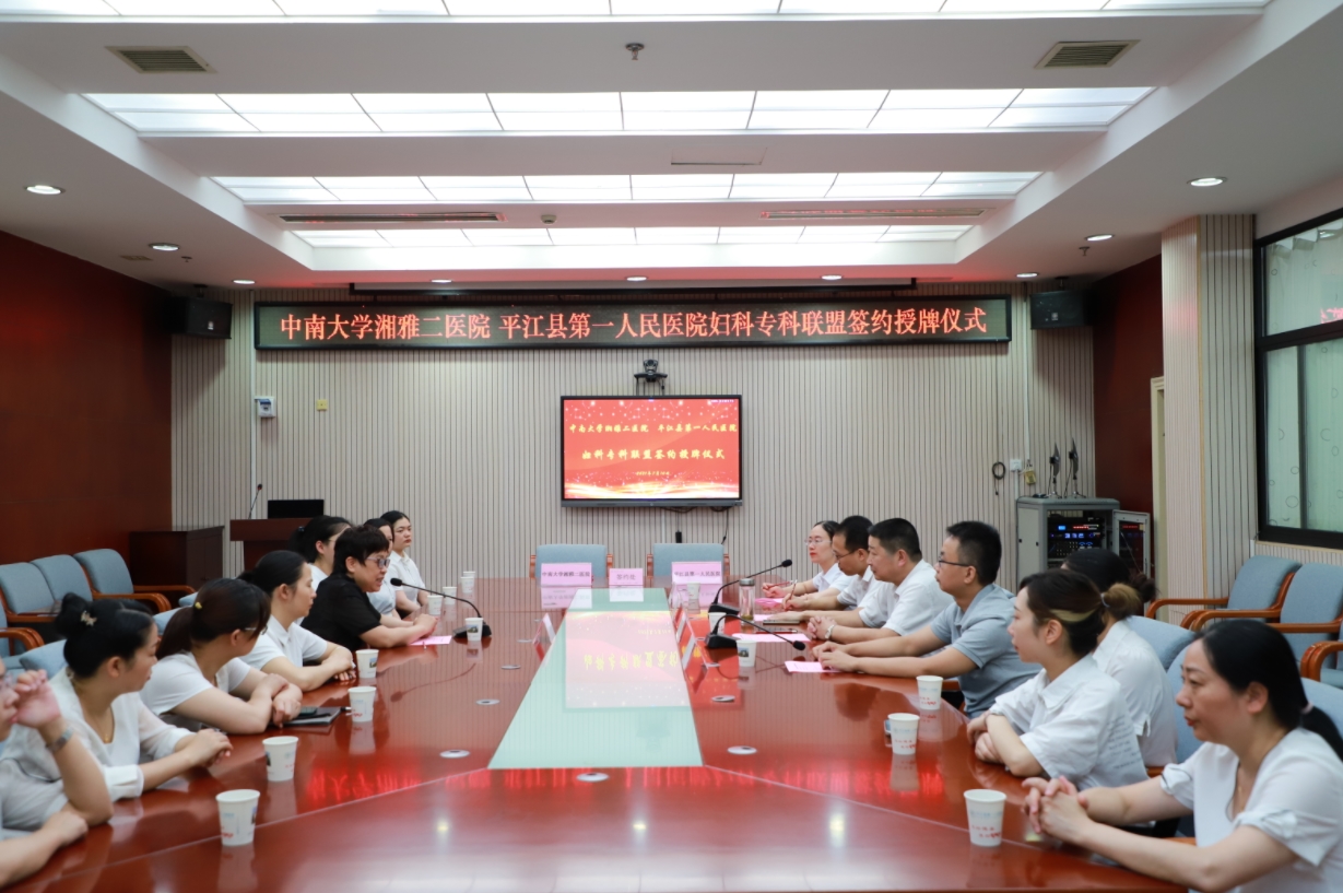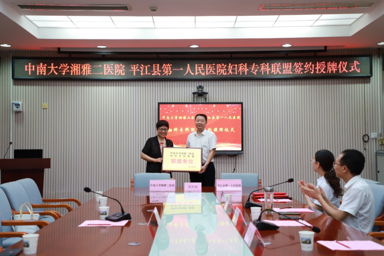 7月10日下午,县第一人民医院与中南大学湘雅二医院举行妇科专科联盟签约授牌仪式,中南大学湘雅二医院妇产科教研室主任、大妇产科主任方小玲教授、该院党委书记柳海鸣、院委委员李春海、医务部常务副部长陈前、妇科主任刘细林及妇科全体医护人员参加,会议由院委委员李春海主持。