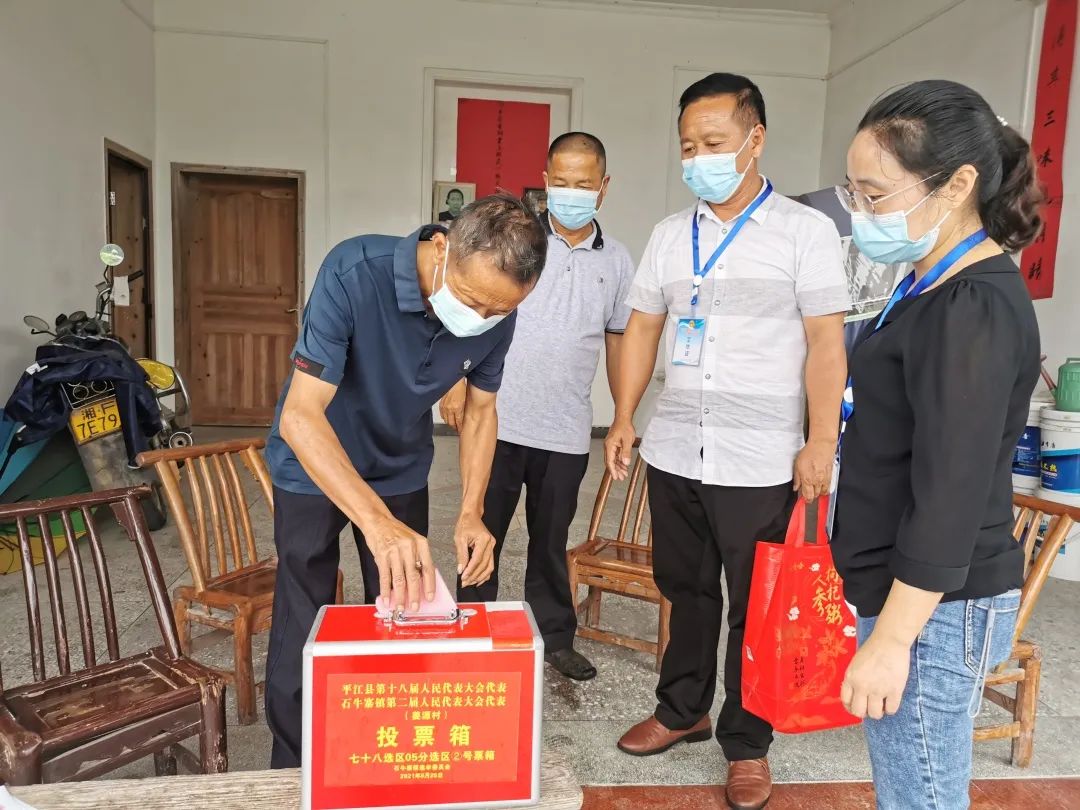 ★ 在石牛寨镇姜源村,镇村工作人员冒着零星小雨,带着流动投票箱走家串户,让选民在自家行使投票权。