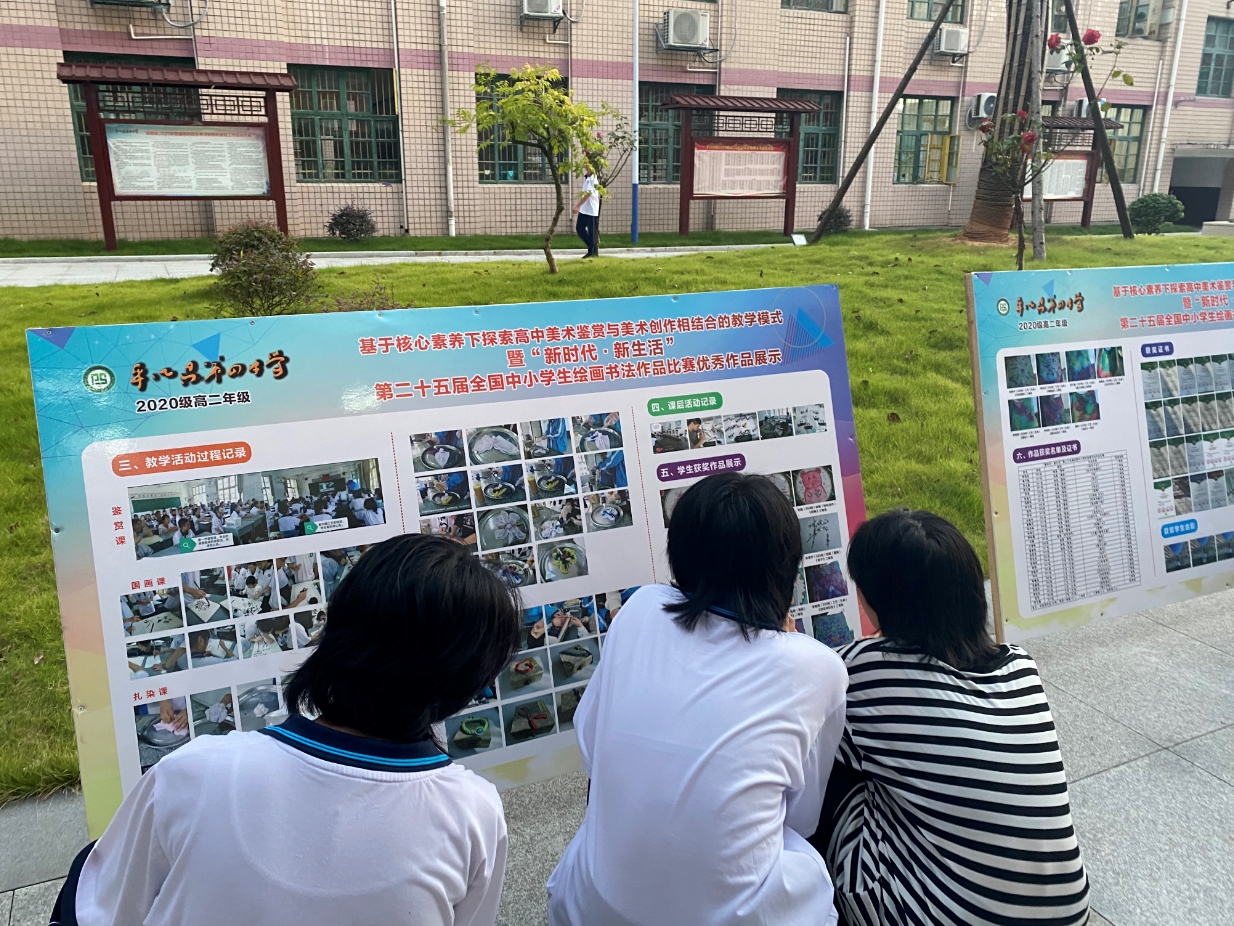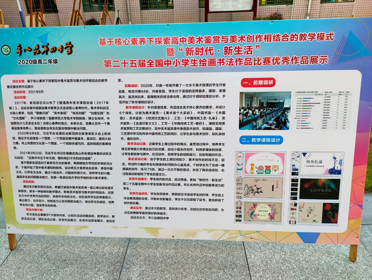 本次活动的主题为基于核心素养探索高中美术鉴赏与美术创作结合的教学模式。活动主要展示7大板块内容,分别为活动前期调研、教学设计、教学活动记录、课后活动记录、优秀作品展示、优秀作品获奖展示、课后反思。目的是在进行教学反思的同时,通过展览活动,唤起学生学习美术的感知,激发学生学习艺术的兴趣。本次布展得到了学校及年级组的大力支持,展览现场布置是399班同学自发组织,除展板的制作外,包括粘贴画作、展览选址、展览方式,均由学生独立完成。