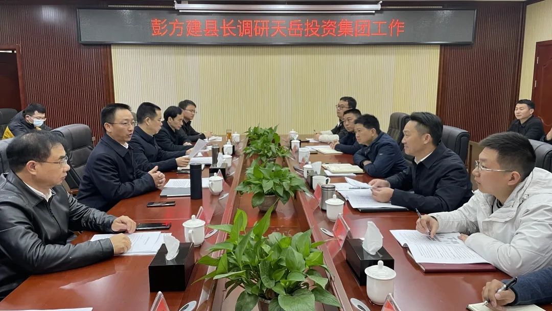 12月14日,县委副书记、县长彭方建在天岳集团调研时强调:要强化政府投资项目全过程监管,全面提升资金使用效益,把节约的资金更多投向民生领域。副县长夏海陪同。