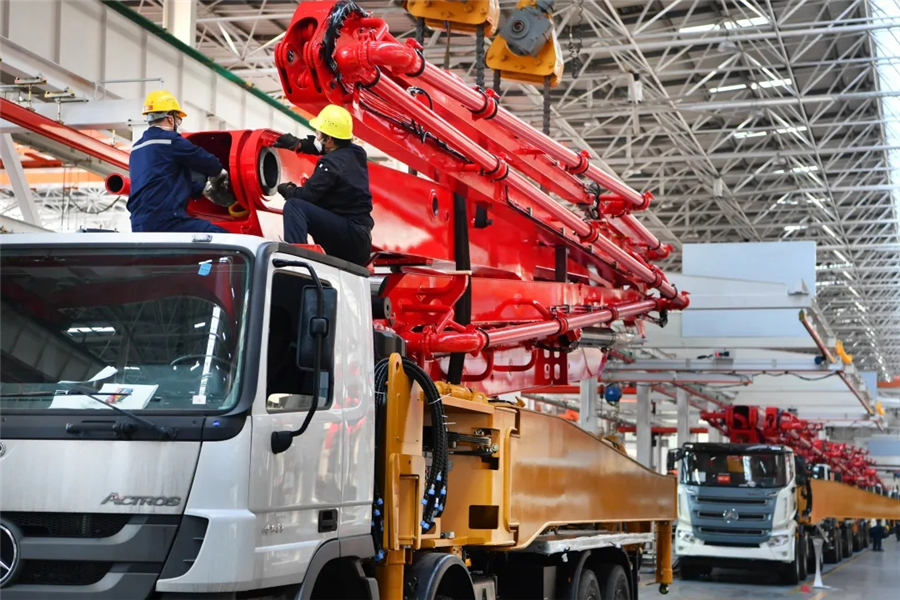 长沙经开区三一重工18号厂房智能化制造车间,工人忙着装配生产发往美国和印尼的订单产品。湖南日报全媒体首席记者 郭立亮 摄