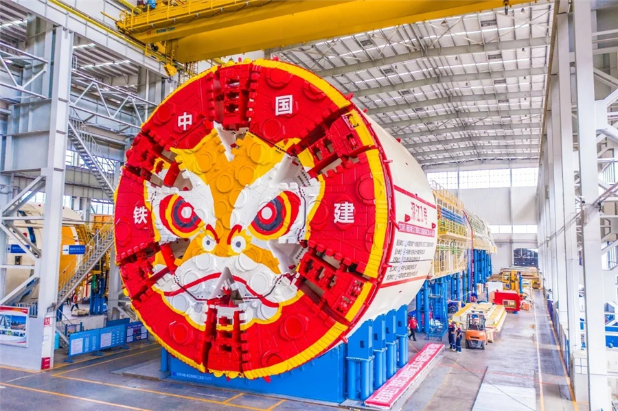 2021年6月22日,铁建重工正式登陆科创板。图为中国铁建重工集团长沙第一产业园,一台刀盘涂装着雄狮图案的大直径盾构机下线。胡清 摄