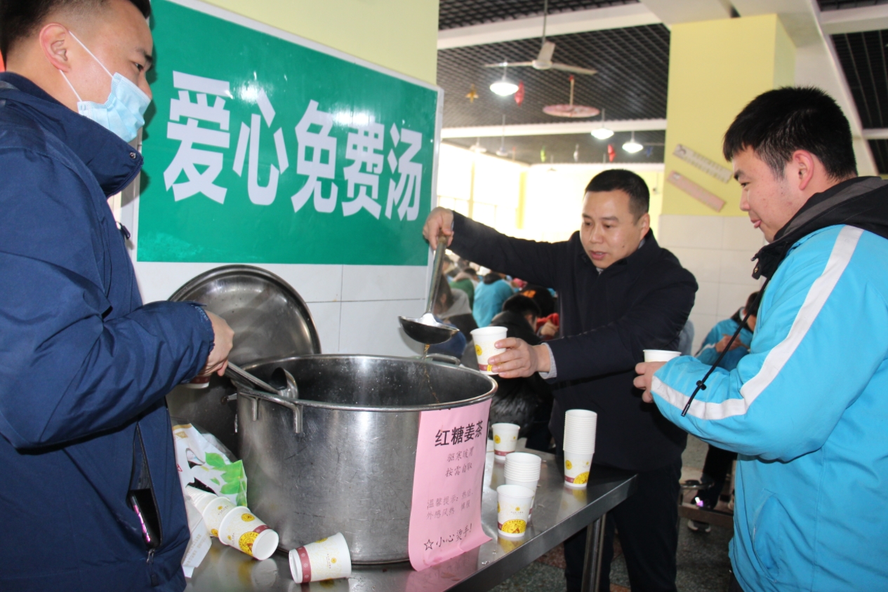 “同学你好,请问需要免费的姜汤吗?”正值午餐人流集中时段,该校负责人与值日行政人员、食堂工作人员一道为就餐的同学盛汤。师生们饮用后纷纷为这“四中牌”春日福利叫好,纷纷表示最近天气寒冷,喝一碗姜汤可以很好地御寒,也可以增强抗病毒和流感的免疫力,既暖身更暖心。