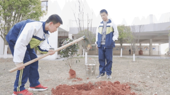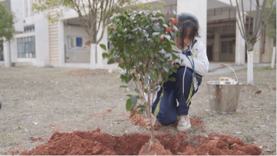 挖土、放苗、填土、浇水,细细地做好每一个步骤,一棵茶树苗就种好了。“待这棵小树长大了,以后给学弟学妹乘凉!”同学们看着小树欢喜地说道“作为一名新时代少年,植树造林、爱护地球是我们的责任。”