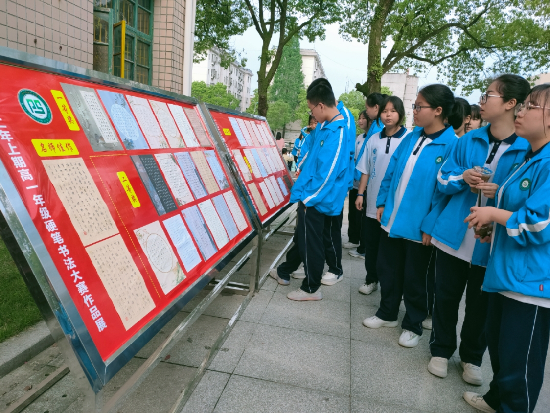 本次书法大赛涌现出一批优秀的学生,在湖南省对联文化传承人、本土书画界名流何跨海老师的评判下,评选出了许多优秀作品,在美术老师的指导下,获奖作品都统一装裱,在学校的移动展板上隆重展出,引得不少师生前来观赏品鉴。何跨海还为师生们展示了原创诗词《沁园春·岸芷汀兰》等2幅优秀书法示范作品。