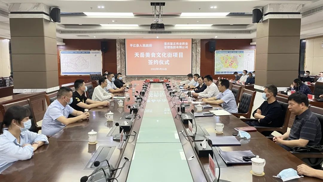 5月24日,天岳美食文化街项目正式签约。重庆鉴正伟业商业管理集团总经理兰华,湖南正睿合商业管理有限公司总经理于庆生,县委副书记、县长彭方建,副县长夏海出席,相关单位负责人等参加。