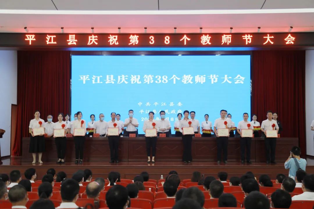 会议对402位优秀教师和教育工作者进行了通报表彰。平江一中被授予“高中教育教学突出贡献奖”。平江一中校长何进、颐华学校校长彭荣宏、优秀班主任代表刘妮、优秀教师代表李海先后作典型发言。
