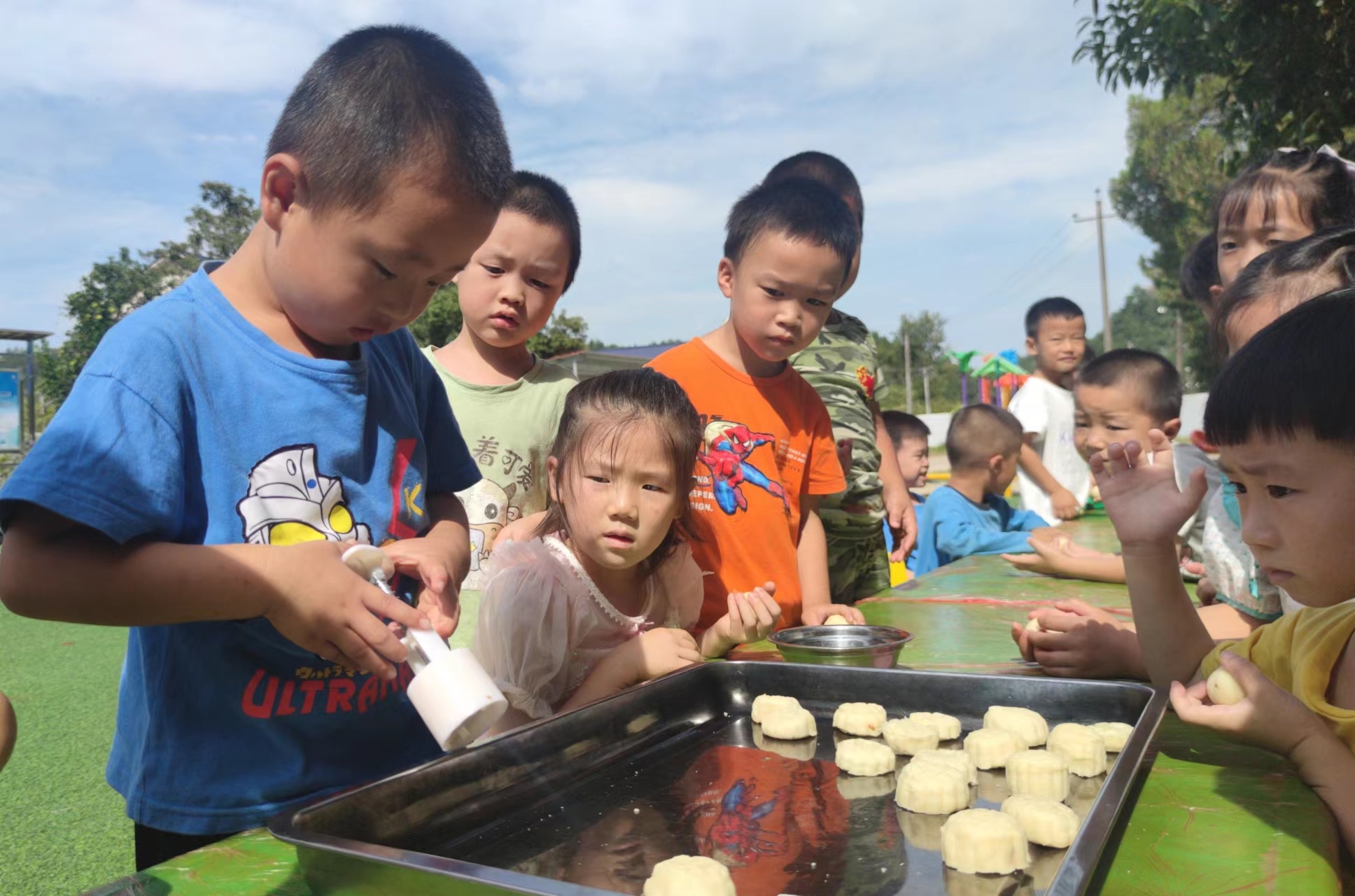 “看看看,老师要变魔法咯,一起见证奇迹吧!月饼变变变,‘哇’我们的月饼做出来咯。”9月9日上午,福寿山镇中心幼儿园举办了“月饼圆圆,一起DIY”的活动。