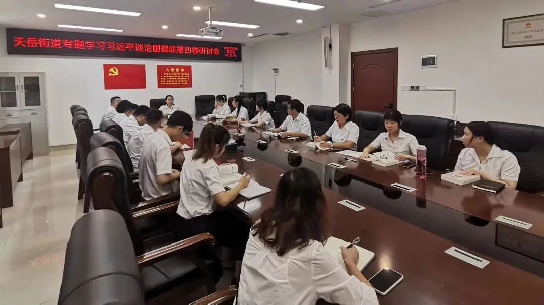 天岳街道办事处召开专题学习《习近平谈治国理政》第四卷研讨会。大家纷纷从自身经历、学习感悟等角度出发,畅谈自身对习近平总书记思想的理解,并表示在以后将时刻保持学习状态,不断加强学习,将习近平总书记的重要指示作为推动工作开展的强大精神力量。