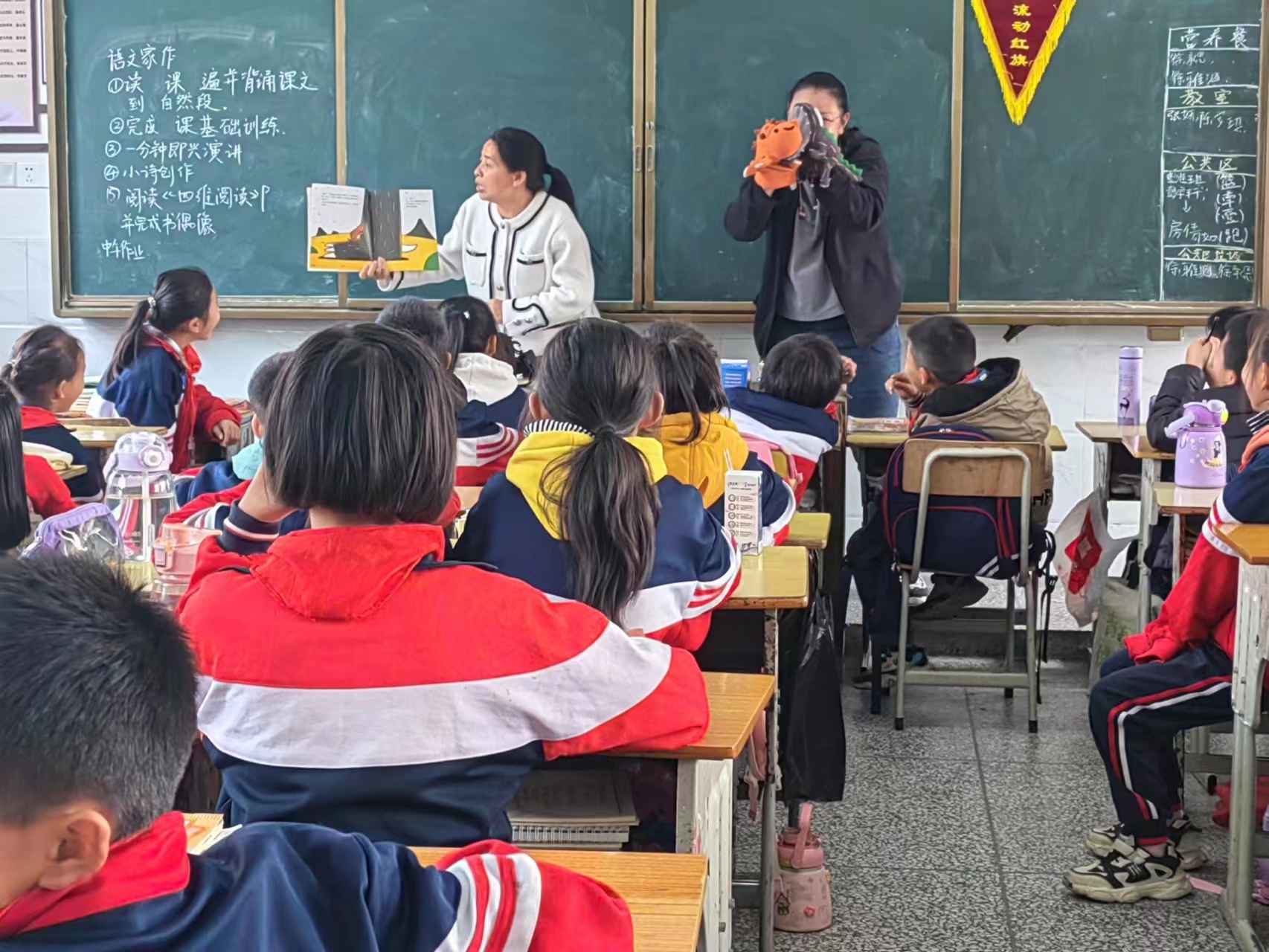 3月16日早晨8点30分,“雷锋”又出现在梅仙镇中心小学四(2)班教室里。原来,她要大展身手,给孩子们上绘本阅读课。首先她讲的第一个故事是《我爱你》,声情并茂的讲述,各种角色肆意转换,加上问题引导,孩子们一会听的如痴如醉,一会回答问题各种奇思妙想不断涌现,孩子们已完全插上想象的翅膀。接着,“雷锋”又和“酷姐姐”合作讲《你看起来很好吃》,酷姐姐朗读故事,“雷锋”现场表演,顿时,教室里一片欢笑声,孩子们乐翻了天。