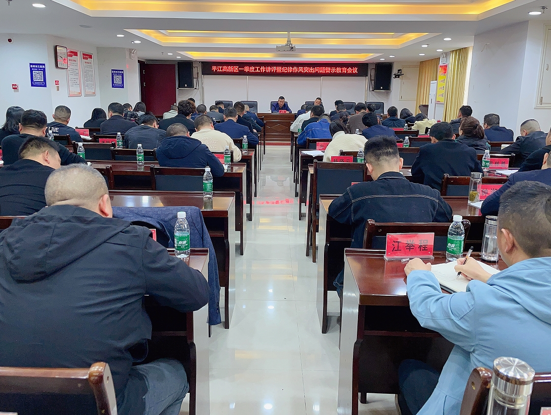 4月4日,平江高新区召开2023年一季度工作讲评暨纪律作风突出问题警示教育会,全面总结前段工作,深入分析当前形势,安排部署后段任务,并就当前纪律作风突出问题开展警示教育。全体班子成员、干部职工共95人参加,会议由党工委副书记、管委会主任刘长江主持。