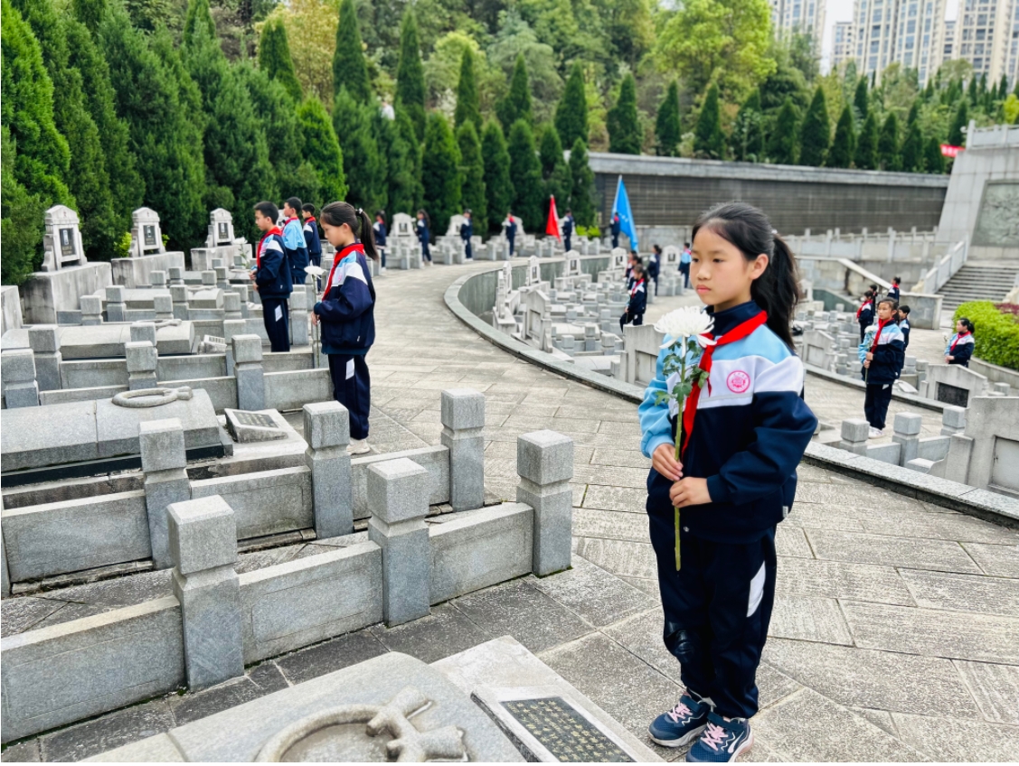 最后,少先队员们有秩序地瞻仰烈士墓,并在有序绕陵墓一圈后,集体面向烈士纪念碑,敬献鲜花并深深三鞠躬,缅怀先烈、致敬英雄。