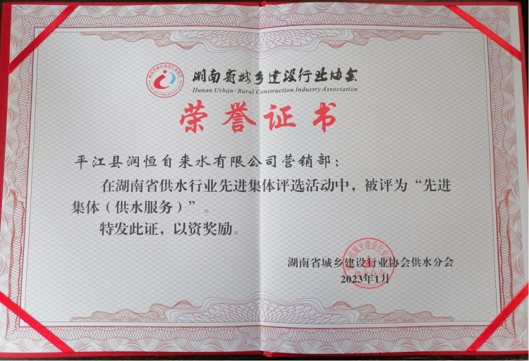 近日,湖南省2022年度供水行业年会在常德市召开,全省市州县供水企业理事成员单位相关负责人参加会议,县润恒自来水有限水司营销部荣获“2022年度供水企业先进集体”荣誉称号。