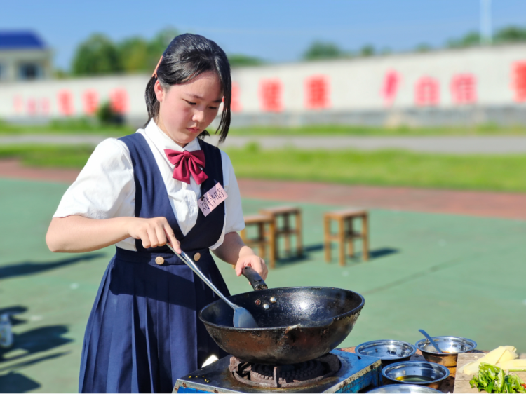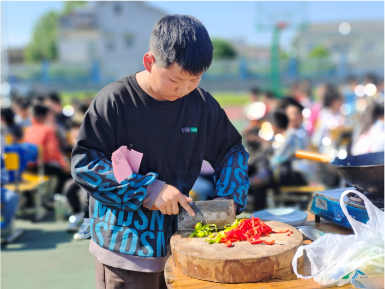 慧心调美味,巧手做佳肴。上场参赛的小选手们早已按捺不住自己的双手,开始准备原辅料。“咔嚓”一声,鸡蛋壳在与碗壁的碰撞中裂开了一道缝,两根大拇指轻轻一掰,鸡蛋壳随即裂成了两半,光滑的蛋黄与凝胶状的蛋清“扑通”一声滑进碗里;红辣椒在切碎的瞬间,令人清醒的刺激性物质已经在试探着你的鼻子,再从鼻子走到舌尖一般,只闻其香,先知其辣爽的滋味;切土豆丝时,如光影交错,无不令人赞叹……每个人的脸上都有着不同的神情,快乐的、慌张的、急促的、哈哈大笑的、宁静的,像一个调色盘,尽情彰显着自己的个性。他们纷纷亮出自己的杀手锏,于锅、碗、瓢、盆之中大显身手,娴熟的烹制手艺,规范地操作,一道道色香味俱全的菜品在他们的巧手之下呼之欲出,令人垂涎欲滴。他们的表现完全不逊色于任何一位大厨!“学校劳动教育抓得好,我们家长跟着享福喽!”旁边观看的家长忍不住感叹道。