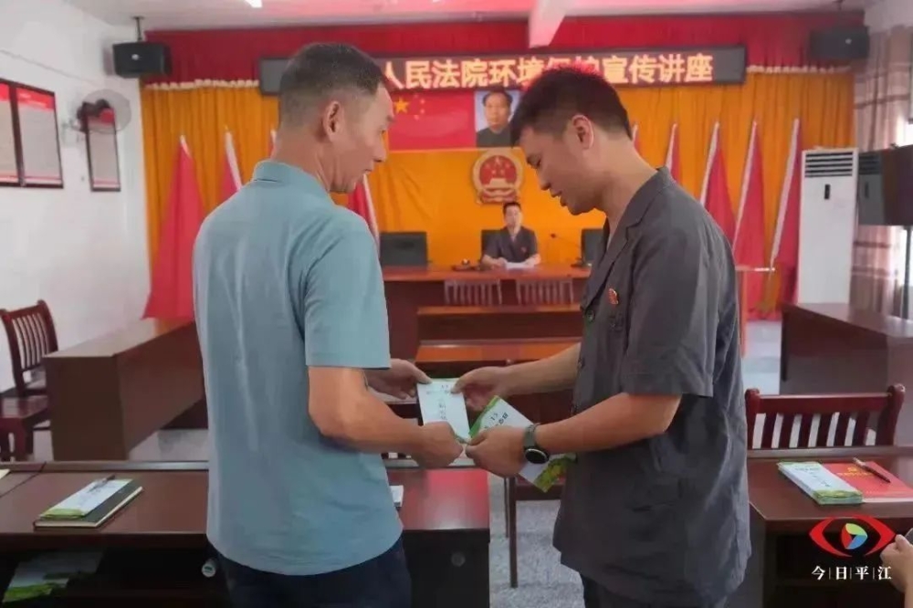 庭审结束后,法官就地开展环境资源保护法律知识宣讲,向旁听群众发放法律知识宣传手册,让群众全面了解了平江县人民政府关于《全县重点水域实行全面禁捕限钓的通告》(平政告〔2022〕1号),引导村民树立生态环境保护意识,共同守护生态资源。