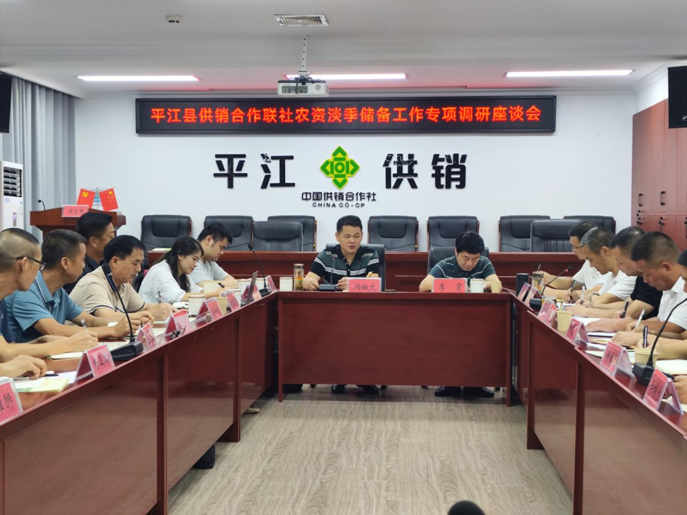 9月7日,岳阳市供销合作联社党委成员、理事会副主任、市惠农农服公司董事长、总经理周傲文,岳阳市供销合作联社四级调研员、市惠农信息公司董事长、总经理李霄一行赴平江县调研农资淡季储备工作,并召开座谈会。县供销合作联社党组成员及相关股室负责人、县旺农农资公司经理、各基层供销社主任、部分村级供销社负责人等共计30余人参加会议。会议由县社党组成员、理事会副主任罗贺根主持。