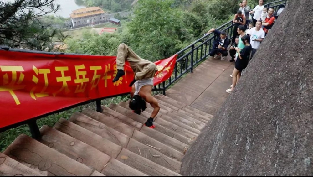 国庆期间,众多健身达人齐聚天岳广场,开启了一场街头健身交流会。10月3日,健身达人郑大超在石牛寨徒手倒立行走,成功登顶中国悬崖天眼,吸引了众多游客、网友的关注。