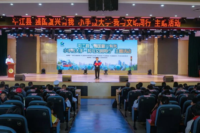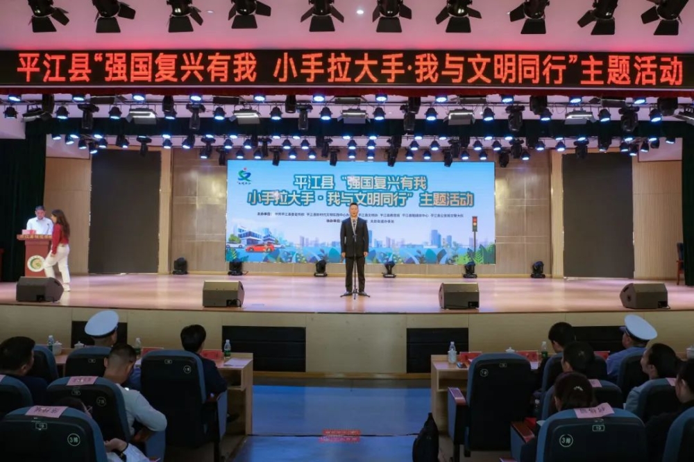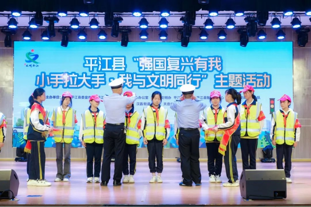 县委副书记、教育工委书记鲁勇宣布活动启动,县委常委、宣传部部长田浩出席并讲话。仪式上,解读了主题活动实施方案,宣读了平江县“小手拉大手·我与文明同行”倡议书和中小学生文明行为“十践行”,并为小交警代表颁授执勤工具。