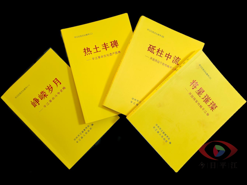 利用好红色资源,发扬好红色传统,传承好红色基因。2017年8月,平江县委县政府成立了“红色平江三年行动计划办公室”,开展全县红色文物调查、保护、研究、利用工作工作,制定了《红色平江三年行动计划实施方案(草案)》,按“一心二带多点”的框架打造“红色平江”。2021年10月成立了“红色平江五年行动计划指挥部”继续致力于推进此项工作,编纂平江红色文化图书便是其中一项重要内容,共有6本书,包括《峥嵘岁月——平江革命斗争史略》《热土丰碑——平江革命文化遗产图典》《将星璀璨——开国将军传略平江卷》《砥柱中流——开国高级干部传略平江卷》《铁血忠魂——平江著名革命烈士传略》《血映花红——平江红色故事歌谣选编》,这套图书特色鲜明,分别从历史、文物、将军、高干、烈士、文艺等不同角度,介绍平江的红色历史、红色文化、红色资源。